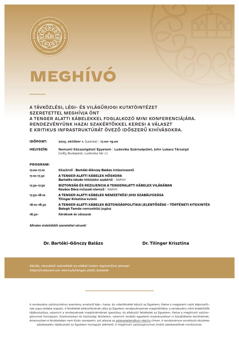 This event is open to the public and aims to foster dialogue on how Hungary and the international community can respond to the strategic, legal, and security challenges associated with undersea cables.